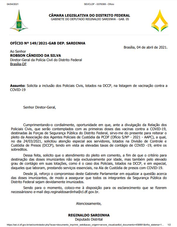 Essa preocupação também foi levantada pelo Deputado Distrital REGINALDO SARDINHA que, por meio do Ofício 149/2021, solicitou à PCDF não apenas considerar a idade, mas também o elevado risco de contágio das unidades de lotação, para definir os critérios técnicos de vacinação dos policiais civis.